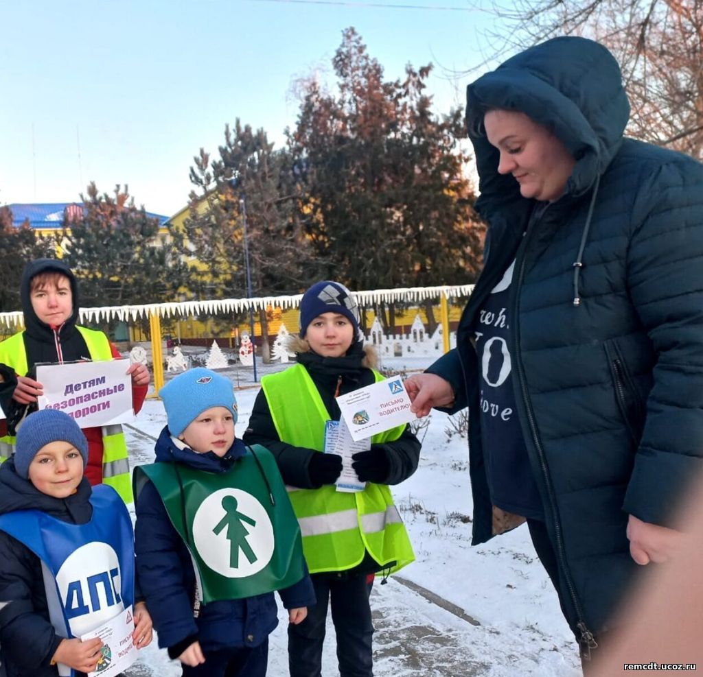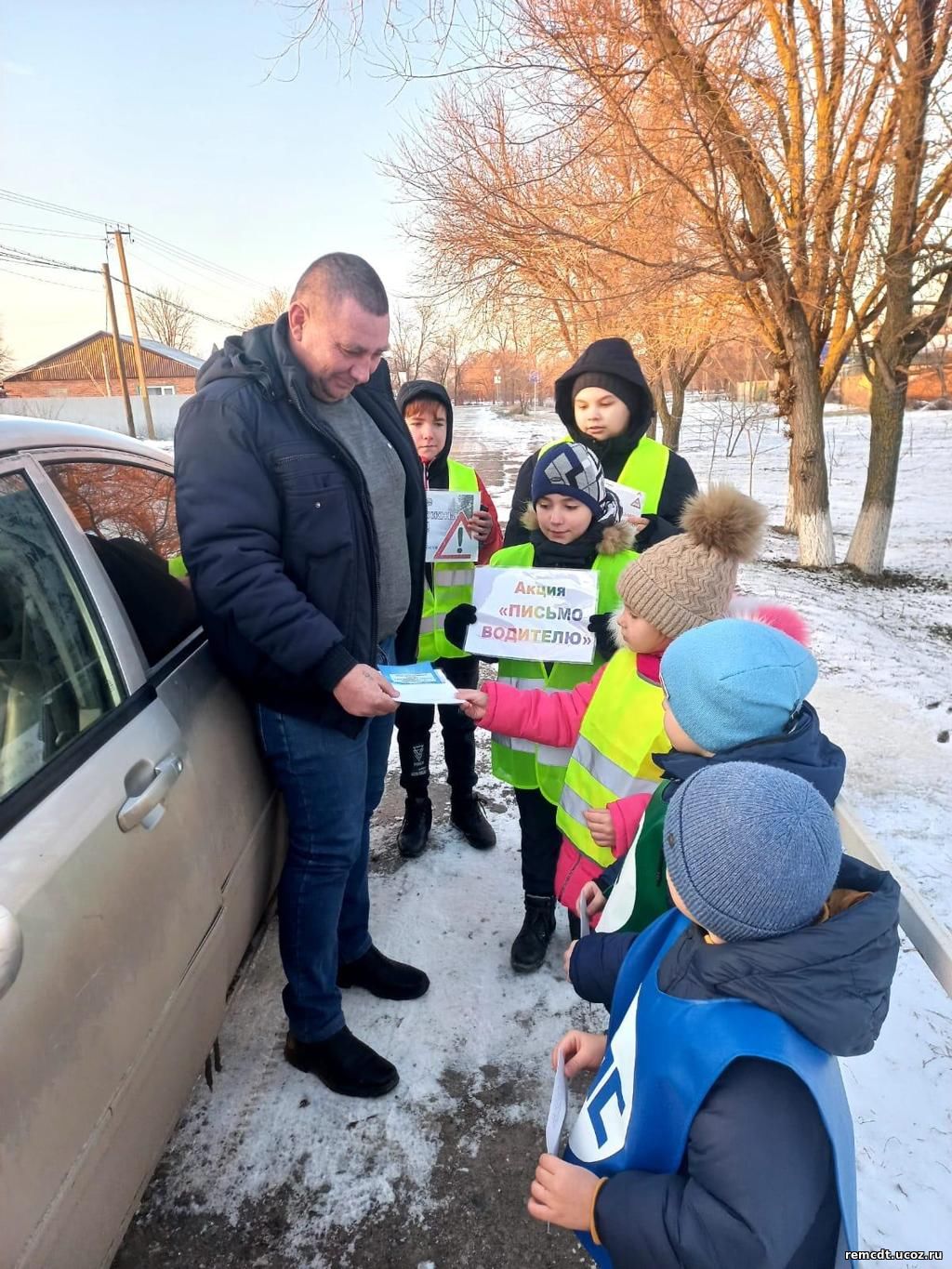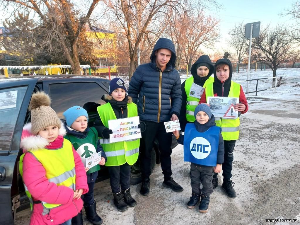 В рамках областного профилактического мероприятия «Безопасная зимняя дорога» проводится социально-значимая акция «Письмо водителю», направленная на пропаганду соблюдения правил дорожного движения водителями и обеспечения безопасности несовершеннолетних на дороге в период зимних каникул. 9 января 2023г. ЮИДовцы Ремонтненского Центра детского творчества, совместно с ЮПИДовцами детского сада «Солнышко» вручили письма-обращения к водителям. Письма отличались по содержанию, но все призывали водителей к одному - соблюдать правила дорожного движения и беречь самое дорогое, что есть – жизнь самих водителей и окружающих их людей. Также ребята раздавали памятки обучающимся: «Снег и дорога», «Правила дорожного движения для пешеходов в зимнее время», «Осторожно, зимняя дорога». Юные инспекторы движения призывали участников дорожного движения «светиться»: носить светоотражающие элементы на одежде.